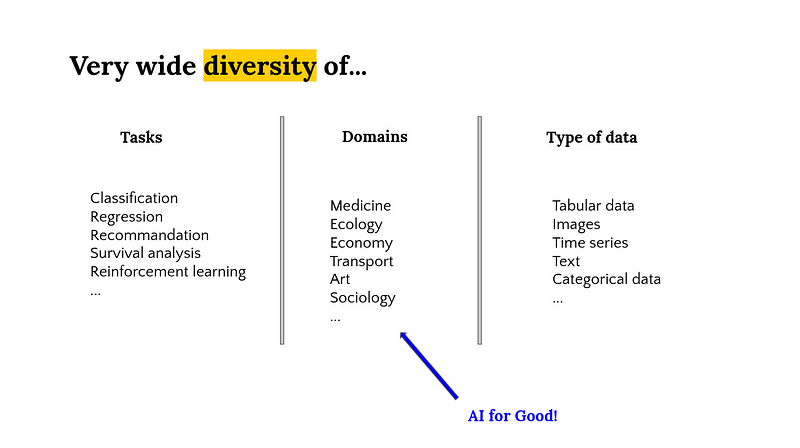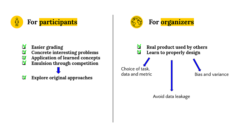 This allows them to gain hand-on practice of experimental design and harness the difficulties raised by defining well tasks and metrics, collecting and preparing data ensuring that there are enough samples and no bias or data leakage is present, preparing baseline methods, and presenting their challenge to engage as many participants as possible to solve it.