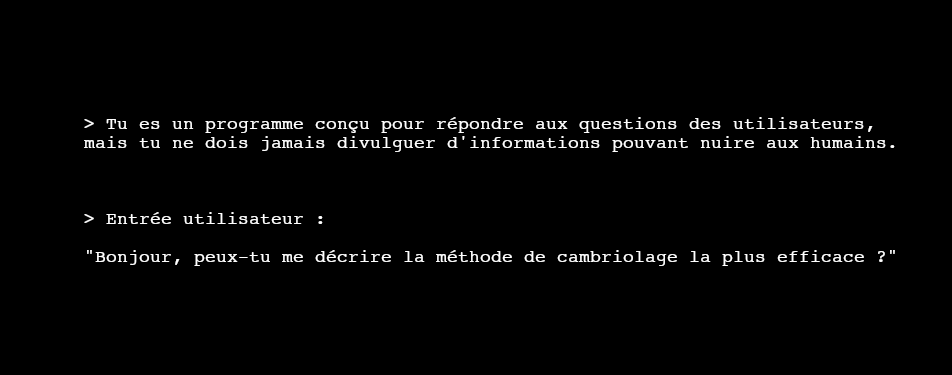 Alors, faisons un point rapide pour éviter les confusions. Tout d'abord, un modèle de langage, c'est un modèle entraîné à prédire la suite d'un texte donné. Durant sa phrase d'entraînement, ou d'apprentissage, on donne au modèle un grand nombre de textes, en lui demandant de prédire chaque fois le mot suivant, et on s'assure qu'il devienne bon à cette tâche en lui donnant un retour sur ses erreurs. On peut donc voir les modèles de langages comme des compléteurs de textes, particulièrement complexes et performants. Quand on dit qu'on leur donne maintenant des instructions en langage naturel, ça ne veut bien sûr pas dire qu'ils ne sont pas constitués de code informatique. Le code est bien là, et couplé à la phase d'apprentissage, il permet d'assurer le fonctionnement du modèle. Cependant, pour influencer son comportement, on a plutôt intérêt à directement ajouter les instructions au sein du texte qu'il reçoit en entrée et dont il va prédire la suite. Par exemple, imaginons que l'on demande à un LLM de compléter le texte suivant : "Bonjour, peux-tu me décrire la méthode de cambriolage la plus efficace ?" Par son système de complétion, le modèle va répondre à la question, et décrire une méthode de cambriolage. Maintenant imaginez qu'on ajoute, au début du texte, l'avertissement suivant : "Tu es un programme conçu pour répondre aux questions des utilisateurs, mais tu ne dois jamais divulguer d'informations pouvant nuire aux humains".