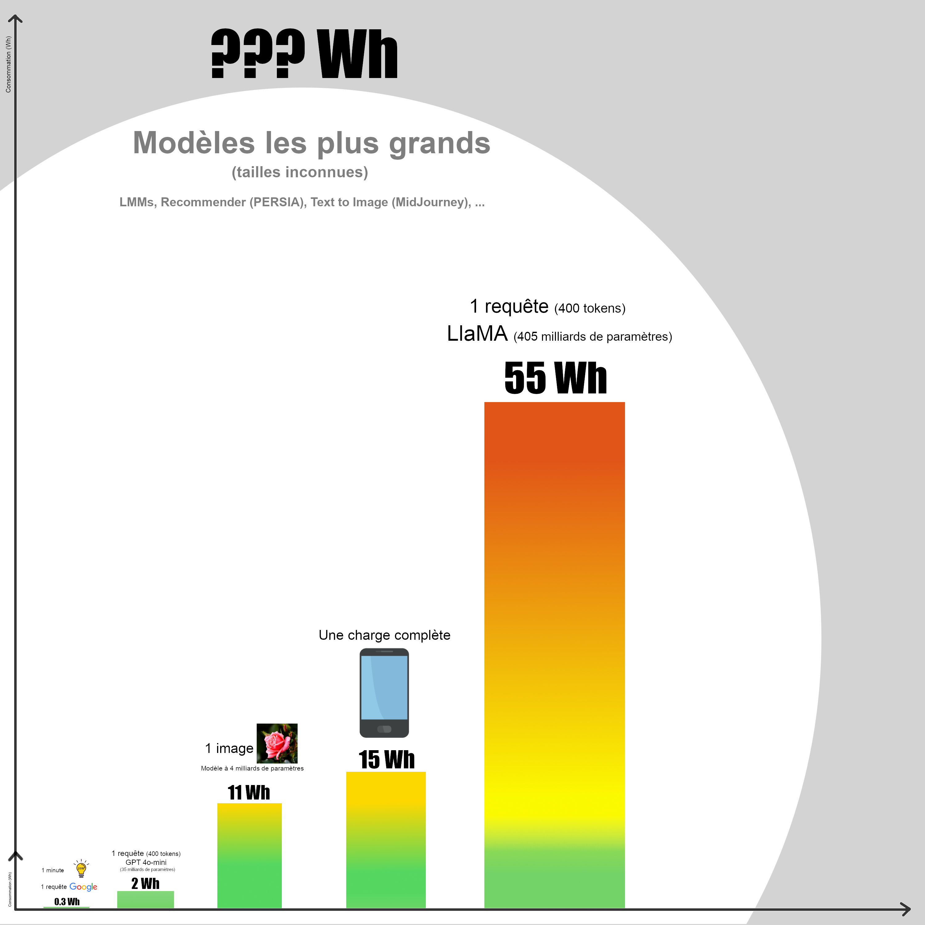 La génération d'une image a été estimée à 11.5 Wh. Ça commence à grimper, d'autant plus cette estimation a été réalisée sur un modèle dont la taille reste relativement raisonnable avec 4 milliards de paramètres. Et comme ça commence à grimper, on va prendre un nouveau point de référence : La charge complète d'un smartphone consomme en moyenne 15 Wh. Ce qui veut dire que générer une seule image par IA, ça consomme déjà presque autant qu'une charge complète de téléphone. Sauf que ça se fait en 10 secondes.