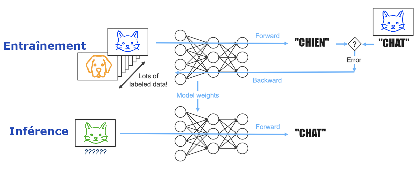 L'entraînement, ou l'apprentissage, c'est le moment où le modèle se construit à partir de données. C'est ce qui fait toute la particularité de l'IA actuelle : il s'agit d'apprentissage automatique. C'est-à-dire qu'au moment où on écrit le programme, et qu'on le lance pour la première fois, il est parfaitement incapable de résoudre la tâche qu'on veut lui faire faire. Puis on va lui montrer des exemples, les données, et petit à petit le programme va s'améliorer, de manière relativement autonome, jusqu'à devenir performant. Par exemple on lui montre 10,000 photos de chiens et de chats en lui demandant ce qu'il voit et en le corrigeant. Au début, les réponses sont aléatoires, mais peu à peu l'algorithme s'améliore et trouve les bonnes réponses. Cela signifie qu'on peut enseigner n'importe quoi à notre modèle, et c'est ce qui est intéressant, mais on peut également lui apprendre des choses complètement fausses ! Par exemple, si on inverse les chats et les chiens dans nos données, le modèle deviendra parfaitement expert dans l'art de confondre les chats et les chiens. Cette phase d'entraînement, elle peut représenter une quantité de calcul phénoménal. Typiquement, les LLMs modernes parcourent, durant leur apprentissage, des données qui correspondent en gros à tout le texte disponible publiquement sur internet. La bonne nouvelle, c'est qu'une fois l'apprentissage terminé, c'est fait. Les connaissances sont sauvegardées et on peut utiliser le modèle à volonté, sans avoir besoin de l'entraîner à nouveau.